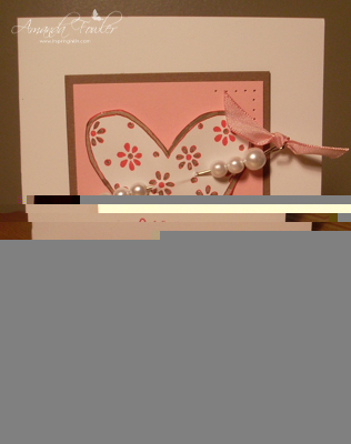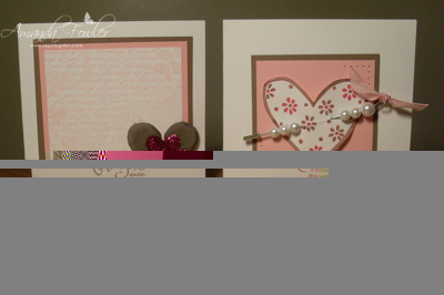 This first card uses the heart from Love you Much stamp set, stamped in Rose Red onto Whisper White card and coloured with markers before cutting out and raised up on dimensionals. A little paper piercing in the corners and the heart is cut through using a hat pin studded with pearls and a little Pretty in Pink taffeta ribbon.