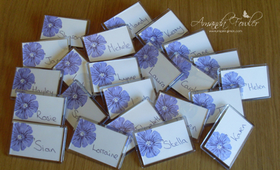 Here are all their name badges ready to go, I’m having a bit of a purple phase at the moment, the badges are stamped with Greenhouse Garden in Lavender Lace and Elegant Eggplant.